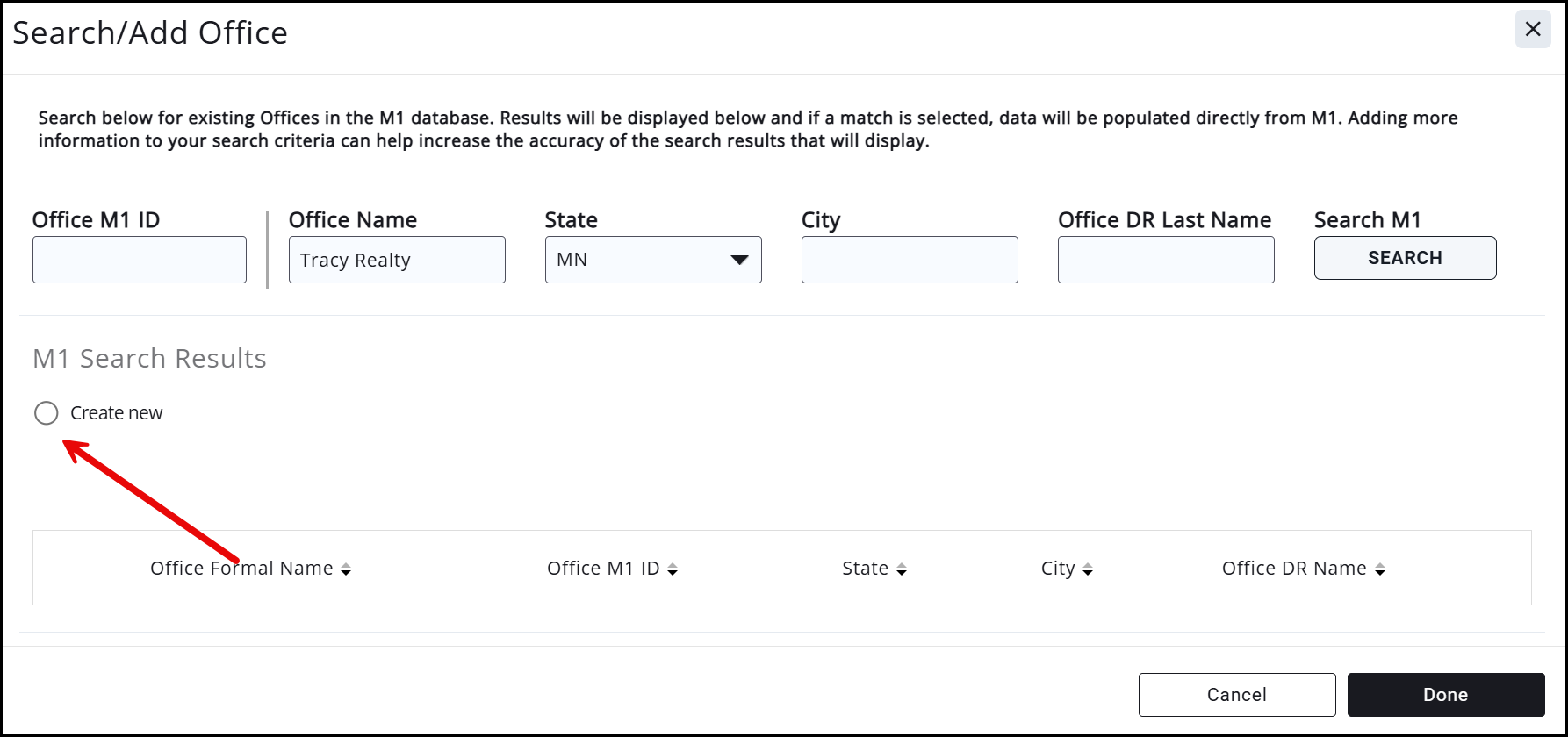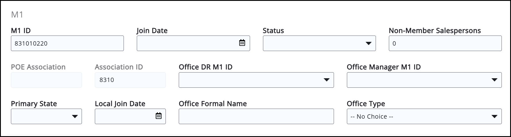 M1 Office*: Select this agent's office from the list. All offices associated to this agent will be displayed for selection. NOTE: The office must exist in M1 database. If there is no office available you must add the office to M1.