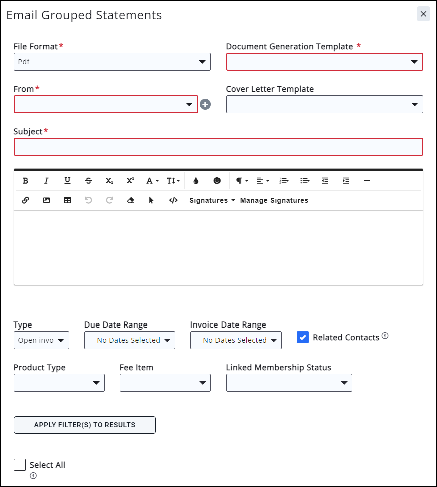 - Due Date Range: Specify the due date range for invoices to be included on the statement.