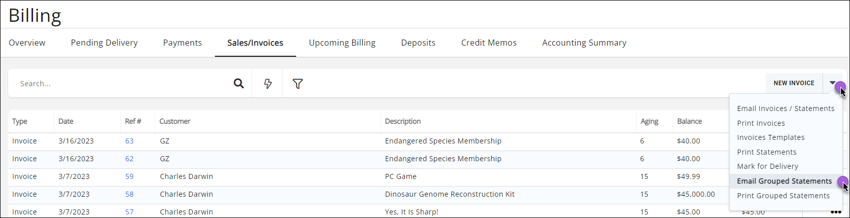 NOTE: Statements may also be sent from a contact's Billing tab by clicking the small actions button. |