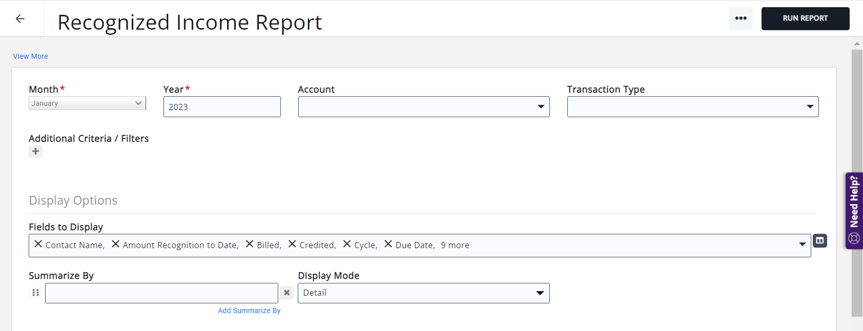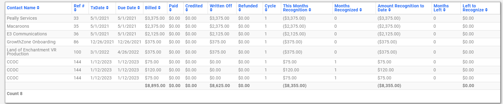 The Recognized Income Report allows you to generate a report displaying income that has been recognized and income remaining to be recognized for a selected month. This report should be used if you are just getting started with GrowthZone and you wish to balance with your old system.