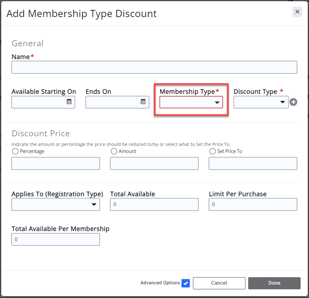 Membership Type - provides a discount based on the membership type of the registrant. This is a multi-select field, allowing you to use the same Discount for more than one membership type.