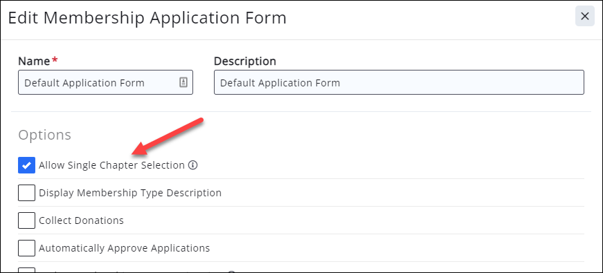 Once you have created your membership types for single chapter selection, you will enable the Allow Single Chapter Selection on the Membership Application form. Click Here for instructions on how to include chapter selection on the Membership Application Form.