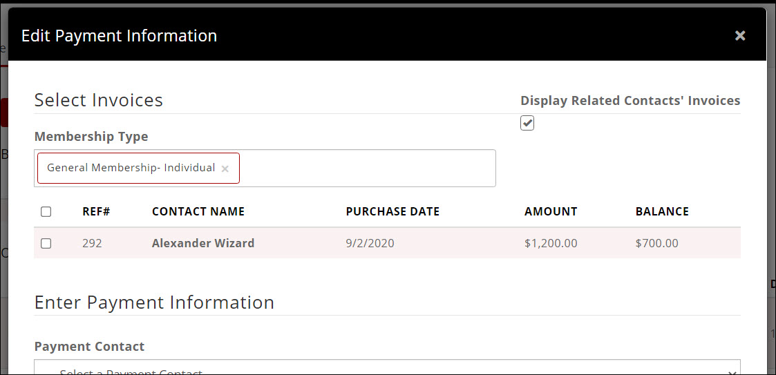 To filter to Membership invoices only, select the desired membership type from the dropdown and the display will update accordingly: