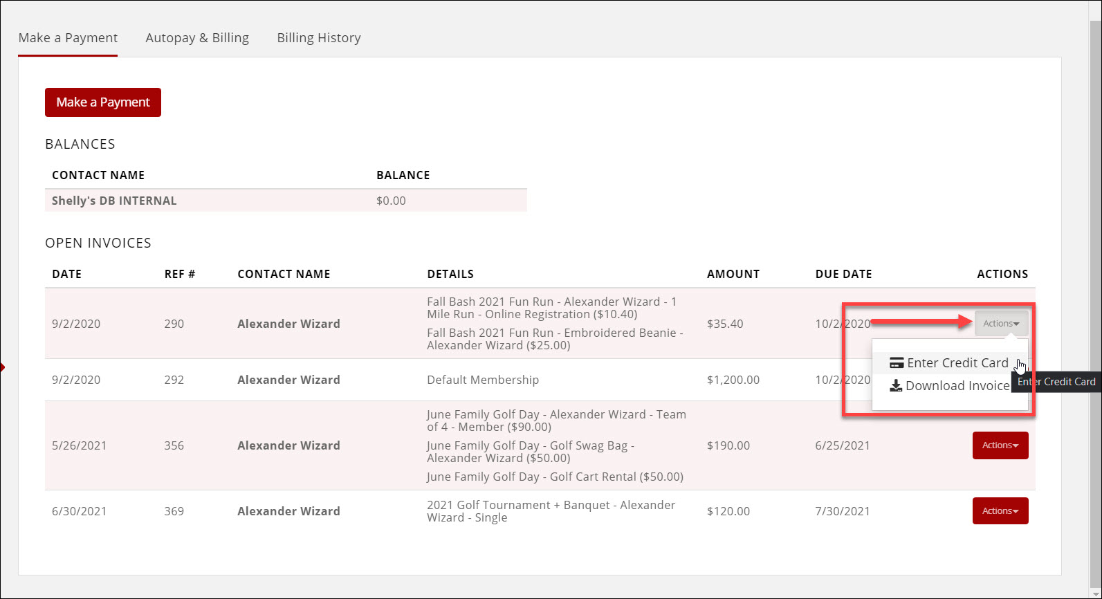 Selecting "Actions" next to an open invoice will allow the member to make a credit card payment or download the invoice.