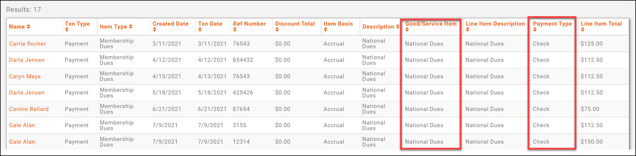 Fee Item: Choose the good(s)/service(s) on which you wish to report. In the example, we wish to report on National Dues paid by check or cash