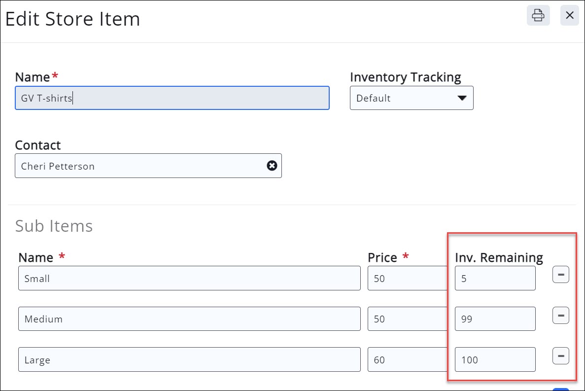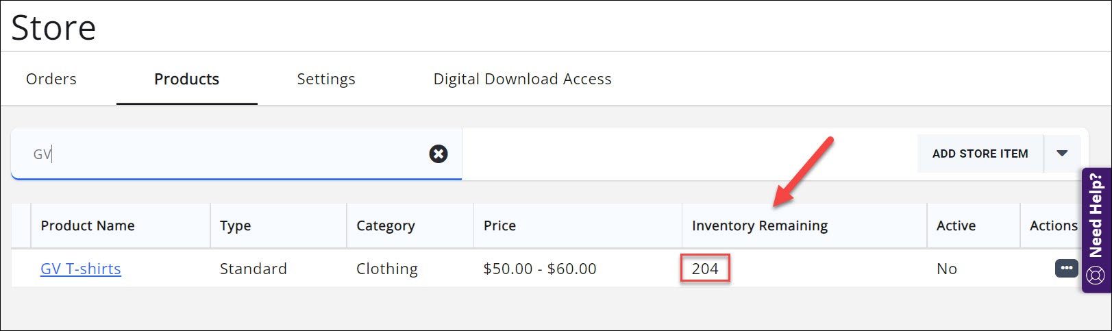 For store items that include sub items (ie. size, color, etc.), you can view remaining inventory by clicking the hyper-link for the store item from the Products tab.