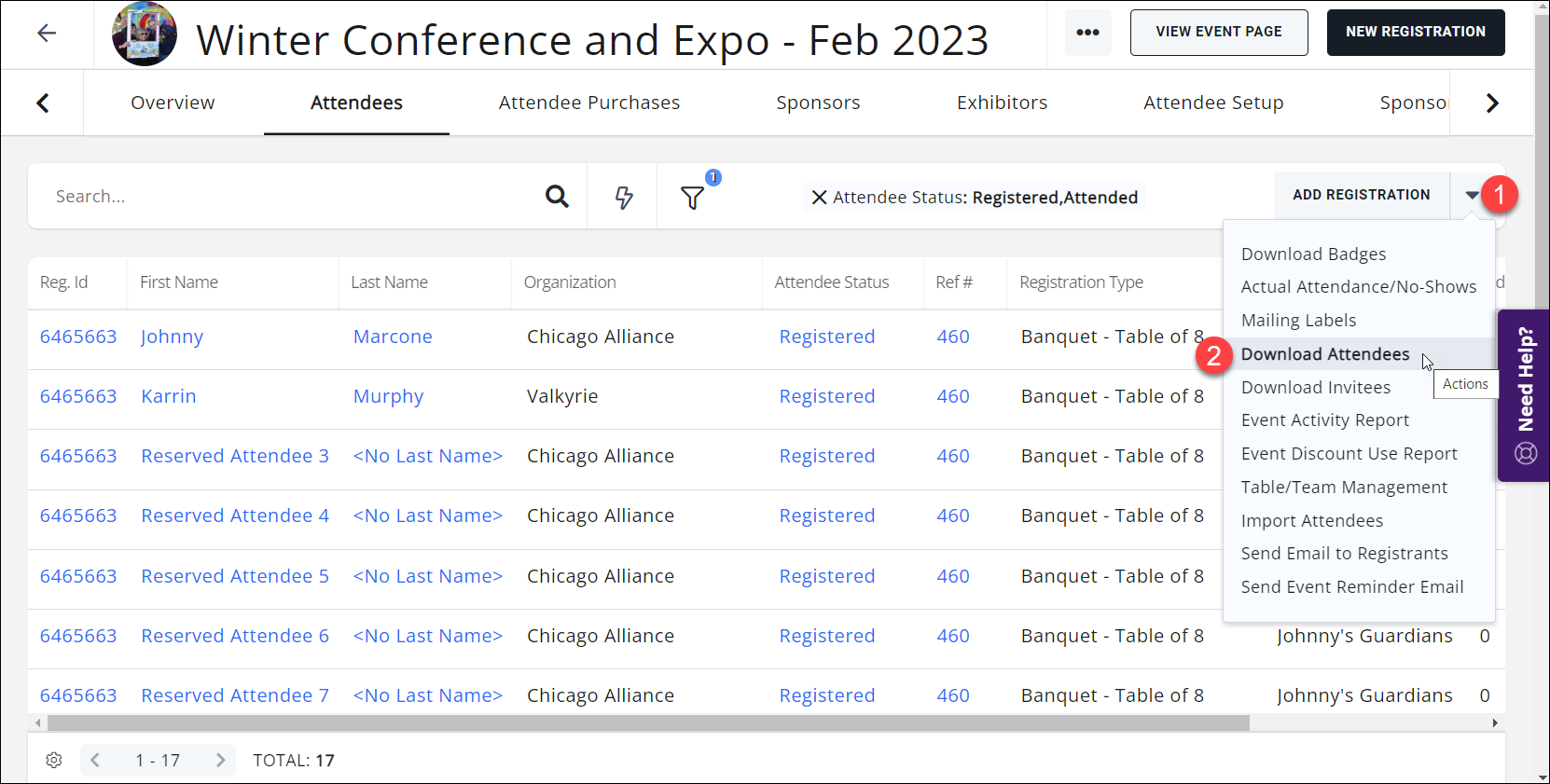 - Click the down arrow next to the Add Registration button and select Download Attendees.