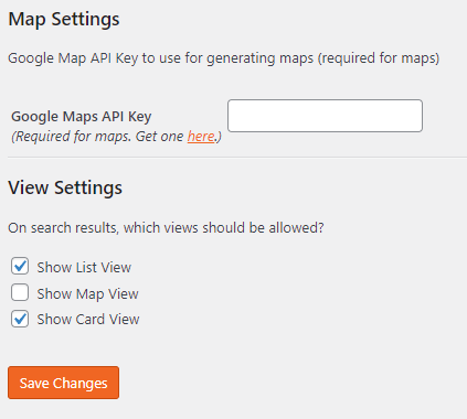 The lower sections of this page will offer additional settings that can be adjusted, including a few show/hide options, Map Settings (this is where to add the Google Maps API Key if they are using maps), disclaimer, and No Search Results message.
