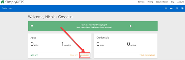 From the SimplyRETS dashboard, click on “YOUR APPS” as shown below: