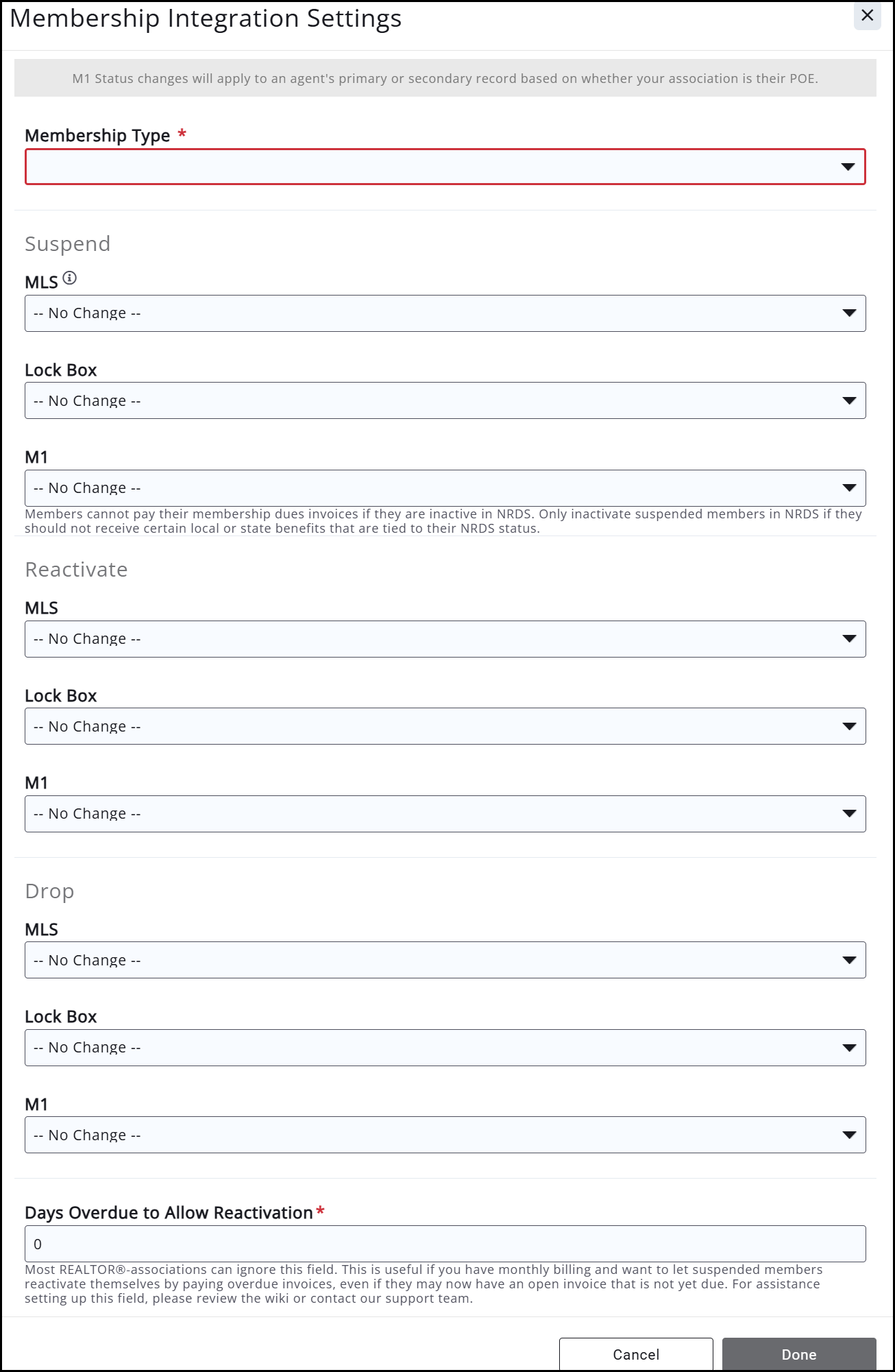 - For each Membership status, select the rule to be applied to M1, MLS and/or LockBox. Note: The choices available will be dependent on your service provider, and you do not have to set rules for all providers. IMPORTANT: In M1, Suspended status is a special status that can only be sent January 1 - March 3 every three years. M1 will reject any status change to Suspended outside of this timeframe. Refer to NAR documentation for further information on the cycle.