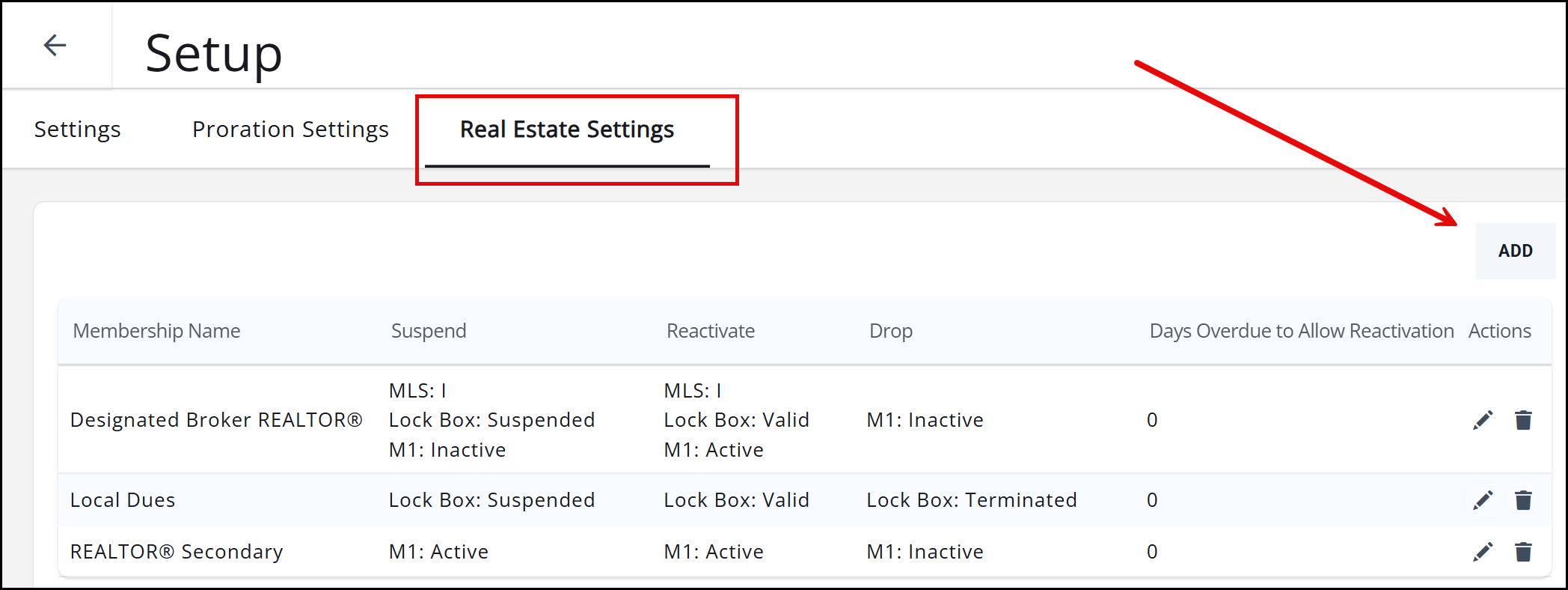 Add a real estate setting - To set the rules for your membership types, click the Add button.