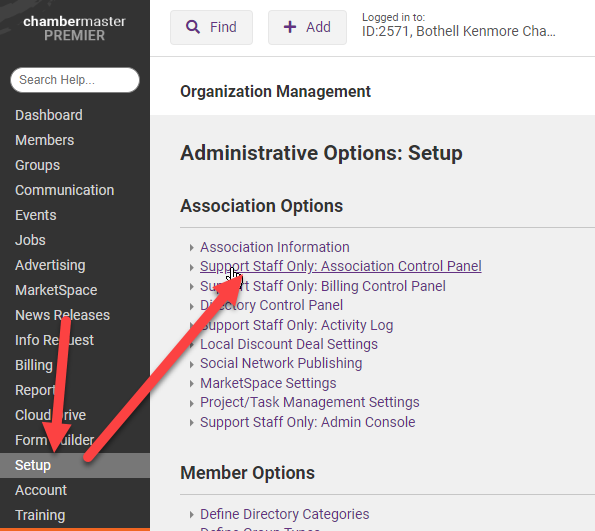 - Go to the Customers Database and go to Setup > Support Staff Only: Association Control Panel