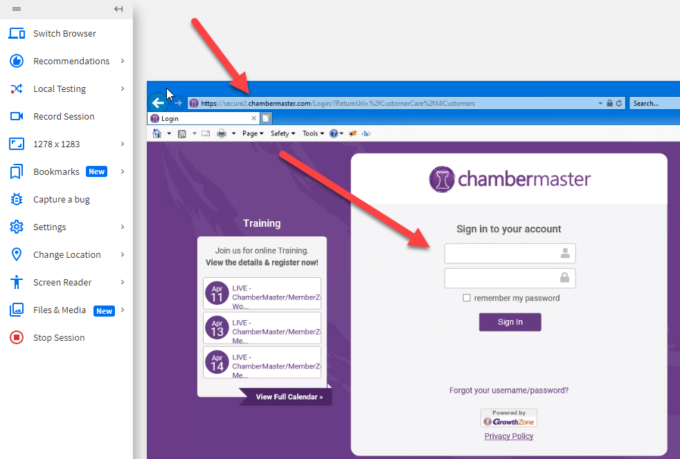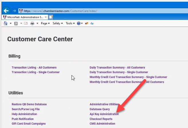 - In the Internet Explorer browser open the following URL and sign into ChamberMaster https://secure2.chambermaster.com/CustomerCare/AllCustomers
