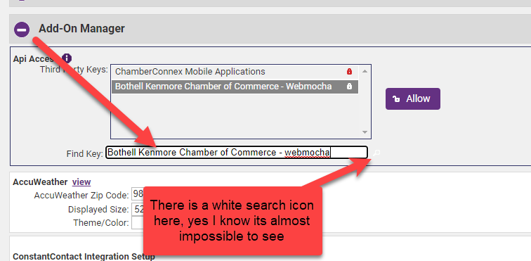 - Go to the Add-On Manager Area and Expand it if needed and in the Find Key area put in the name of the key you created and click the REALLY Hard to see Search Icon that is set to a White Font
