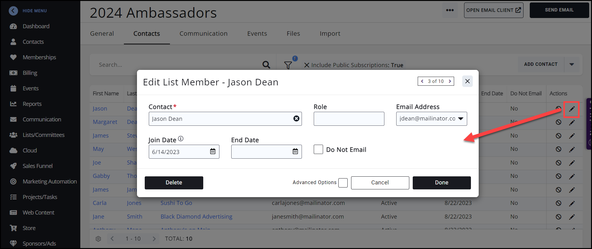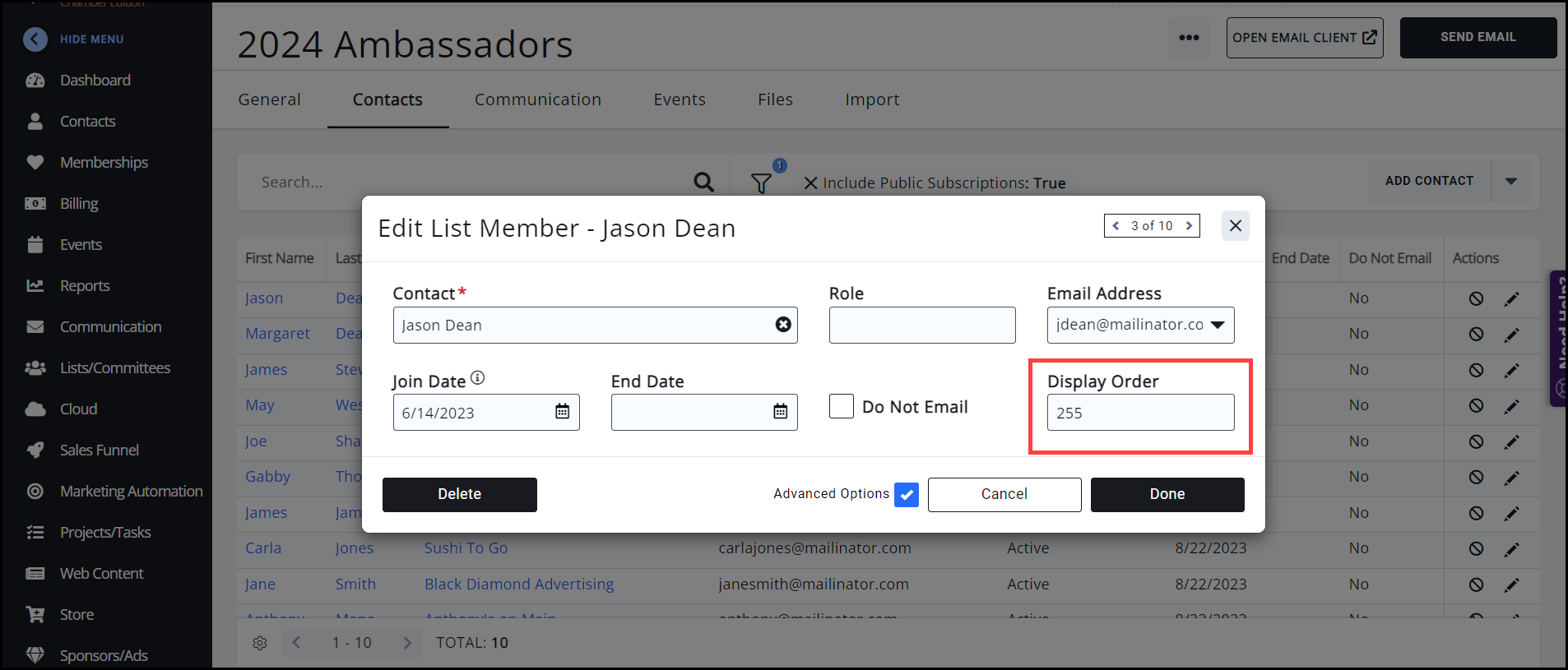 If you have chosen to include a list/committee on your public pages, you may wish to set the order in which contacts are displayed. For example, if you are displaying your staff, you may wish to display the president first, then the executive director, and so on. To organize: