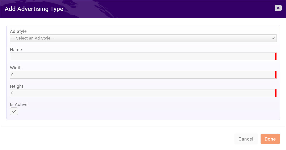 - Specify the width and height of the ad. These fields will populate with defaults according to the ad style selected, but can be changed if needed.