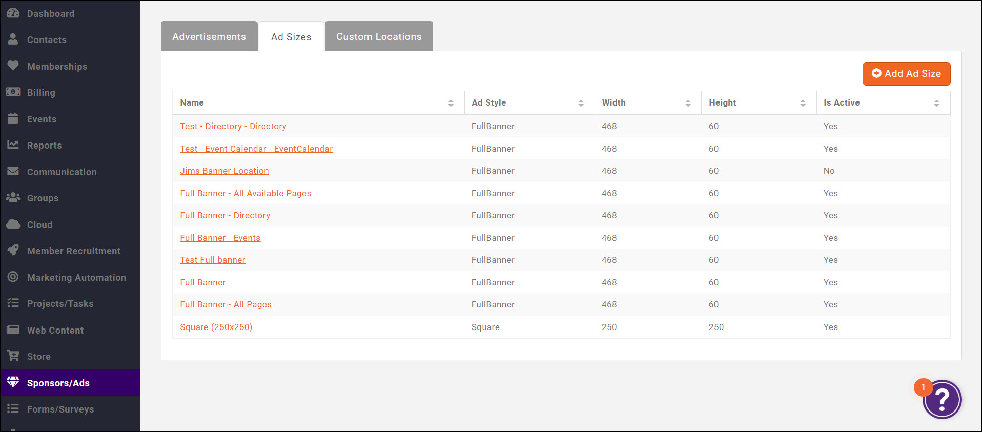 Navigate to the Sponsors/Ads module via your left navigation panel and click into the Ad Sizes tab.