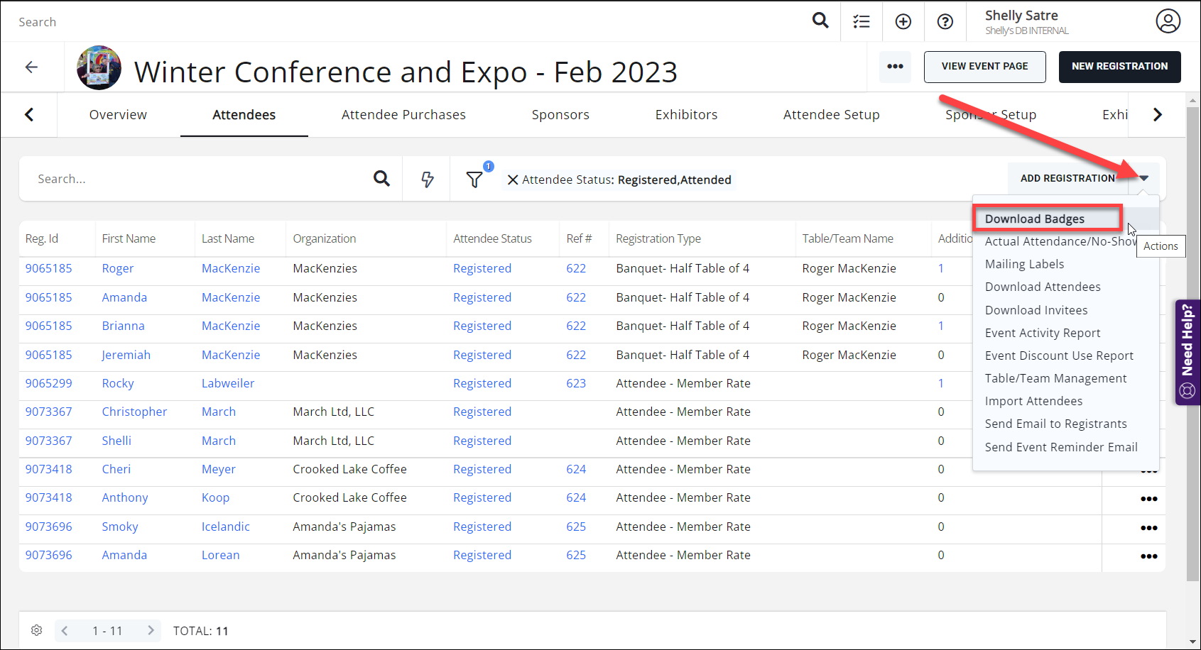 - Click the down arrow next to the Add Registration button and select Download Badges.