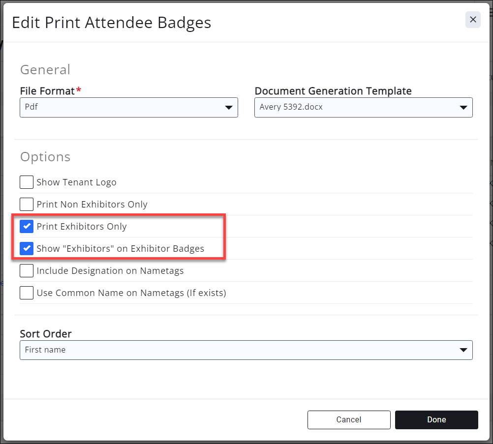 - On the Attendees Badges Print screen: