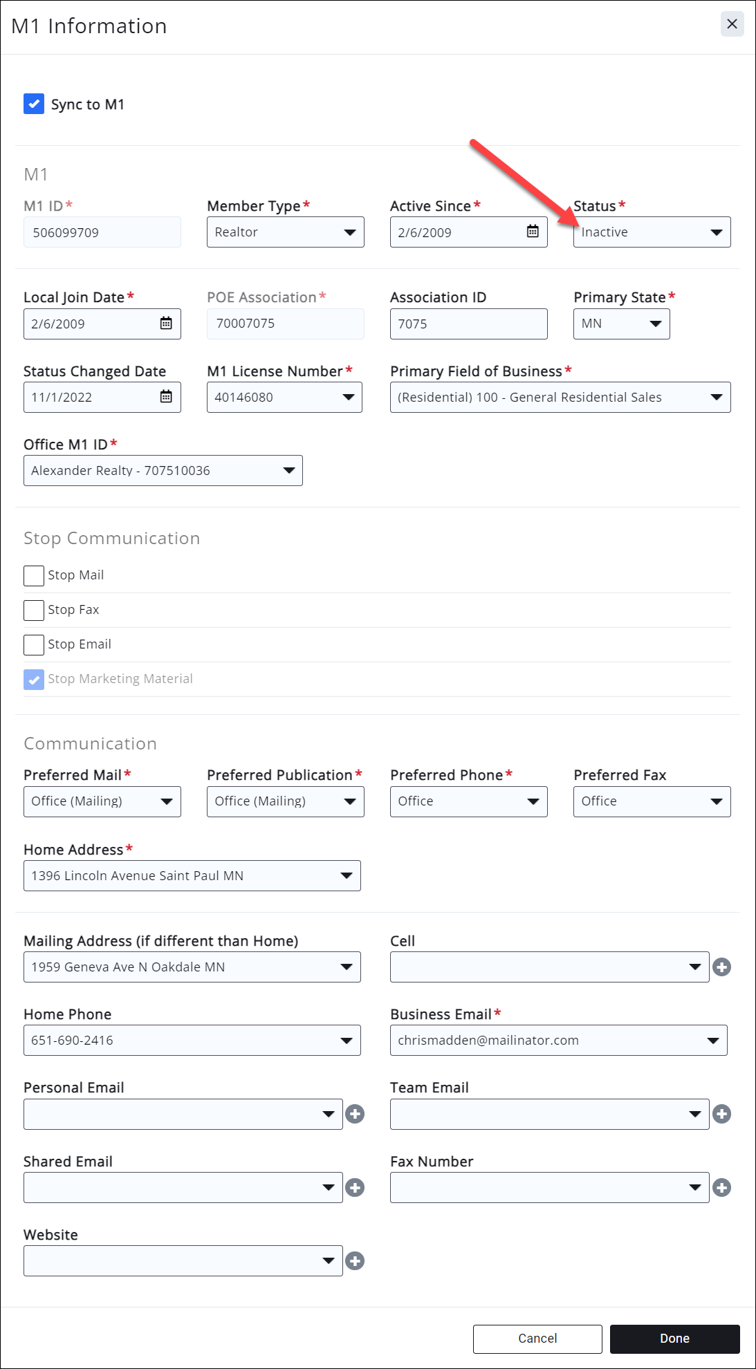 Clicking the pencil icon to edit M1 Information. - Set the agent's status to Inactive.