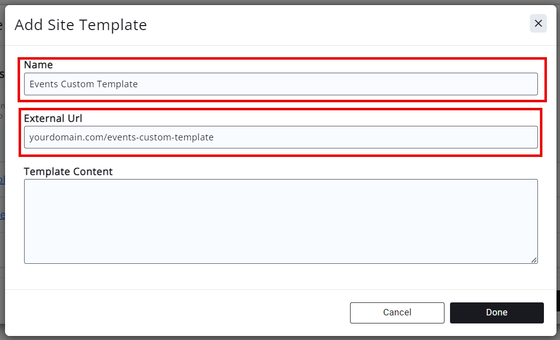 6. In the EXTERNAL URL field paste the URL you copied from your custom template page (for ex. https://www.yourdomain.com/events-custom-template)