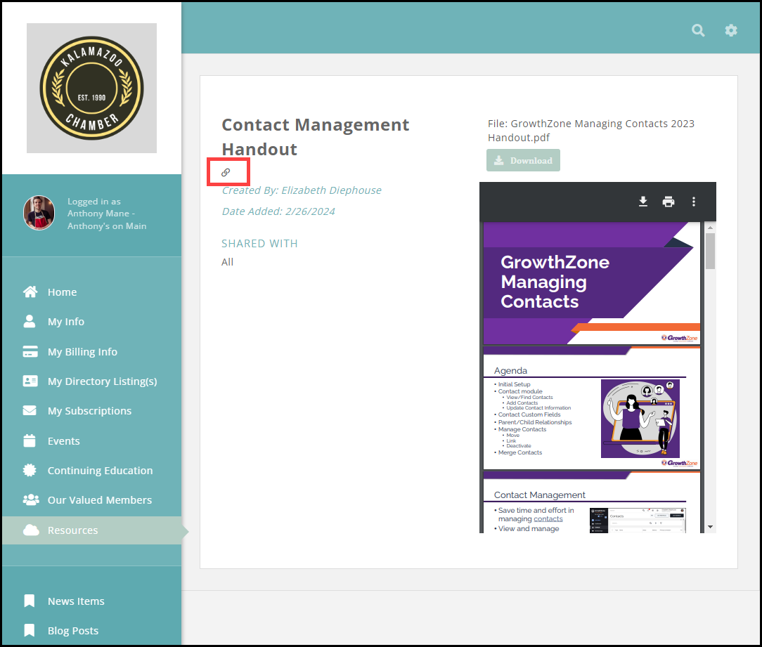 - You can share direct links to any item in the Resources area by clicking the "Copy link to resource" icon after the title in the card, list, or detail page.