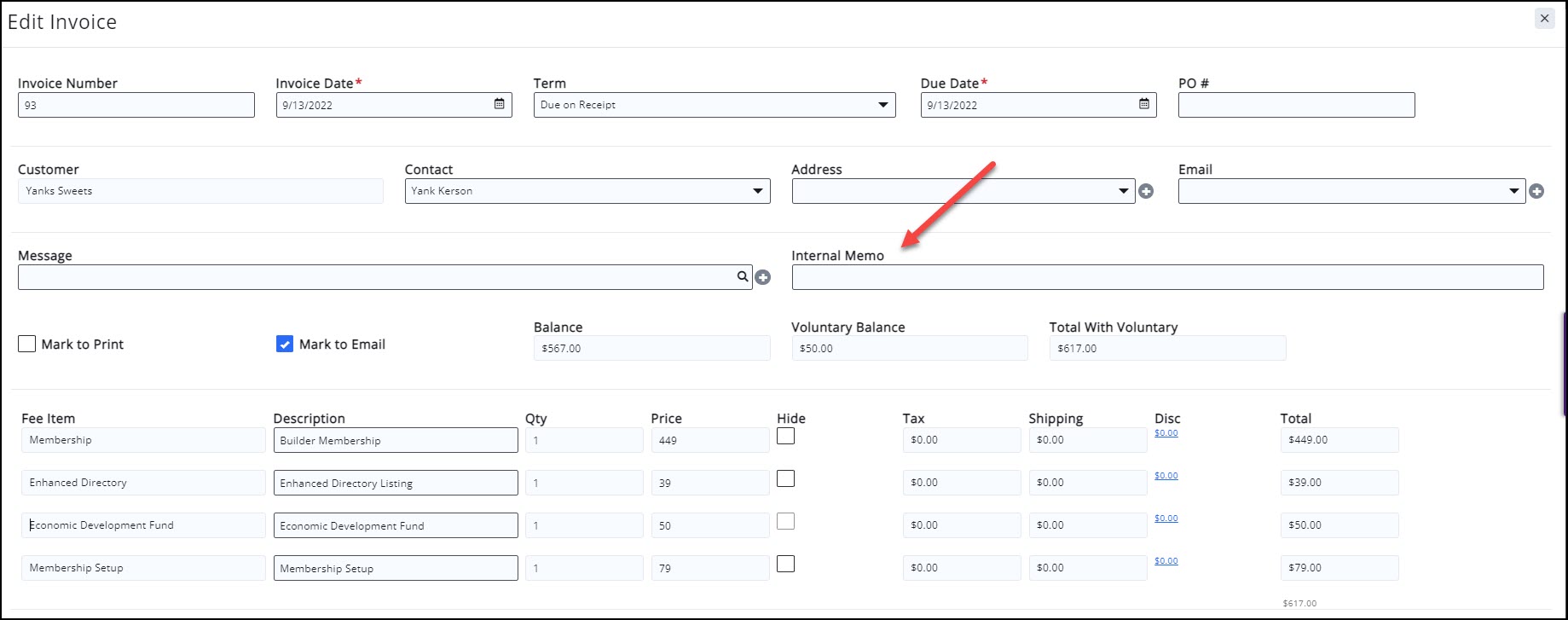 An internal memo may be added to an invoice when created manually or after the fact as described below: