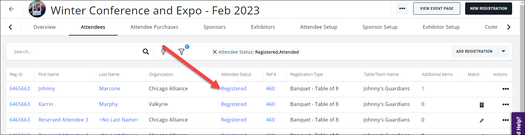 When using this option to check in attendees, it is important to note you can only use one computer to check in all attendees. The reason for this is if two computers are being used, and Computer A marks Attendee A as attended, a timestamp is applied to the Attendees tab. Computer B may not have refreshed their Attendees tab, so on their display, Attendee A is still in a Registered status; if Computer B checks in Attendee B, then a new timestamp is applied to the tab and overwrites the previous status, setting Attendee A back to a Registered status while Attendee B is now in Attended status.