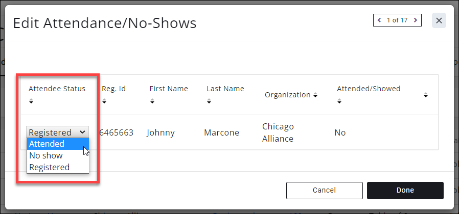 - In the Edit Attendance/No Shows window, click the Attendee Status dropdown and select the desired status (Attended, No Show, Registered).