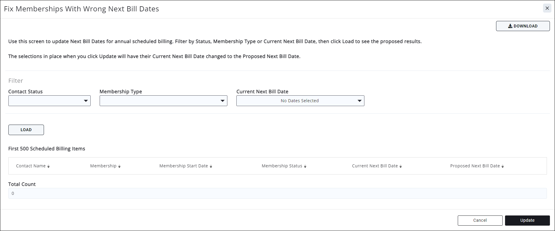 - Use the Filter section to filter results (if needed) by Status, Membership Type, or Current Next Bill Date. Then click “Load” to see the proposed results.