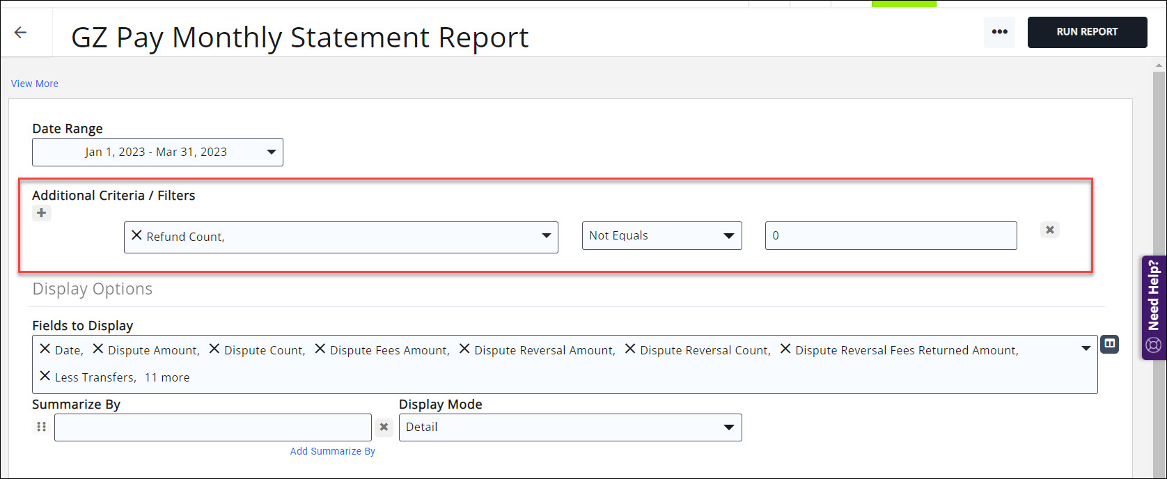 - Enter desired filterin options. For example, if you are looking for refunds you could add Recount Count Not Equals 0 as shown in the screenshot below.