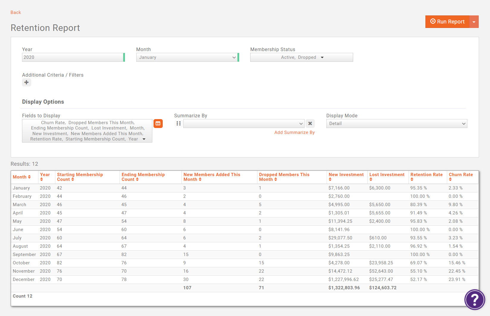 - Lost Investment: Total of all scheduled billing items tied to the memberships for Dropped Members This Month. This includes all scheduled billing items not ended plus those that are ended with an end date during this 12 month period (most of them will be)