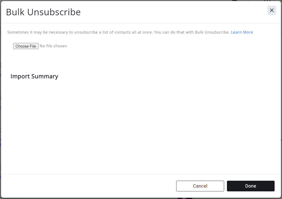 Sometimes it may be necessary to unsubscribe a list of contacts all at once. If this is needed, you can use the Bulk Unsubscribe option. You can find this in the Setup area, under Communications.