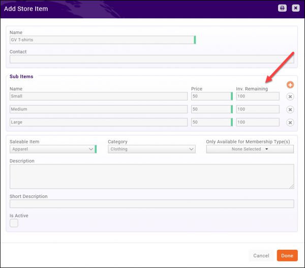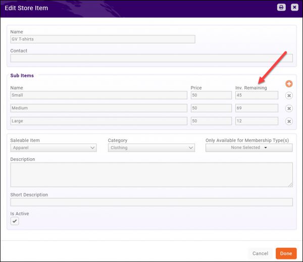 For store items that do not included sub items, you can view inventory remaining for those products, within the Store module, on the Products tab. For store items that include sub items (ie. size, color, etc.), you can view remaining inventory by clicking the hyper-link for the store item from the Products tab.