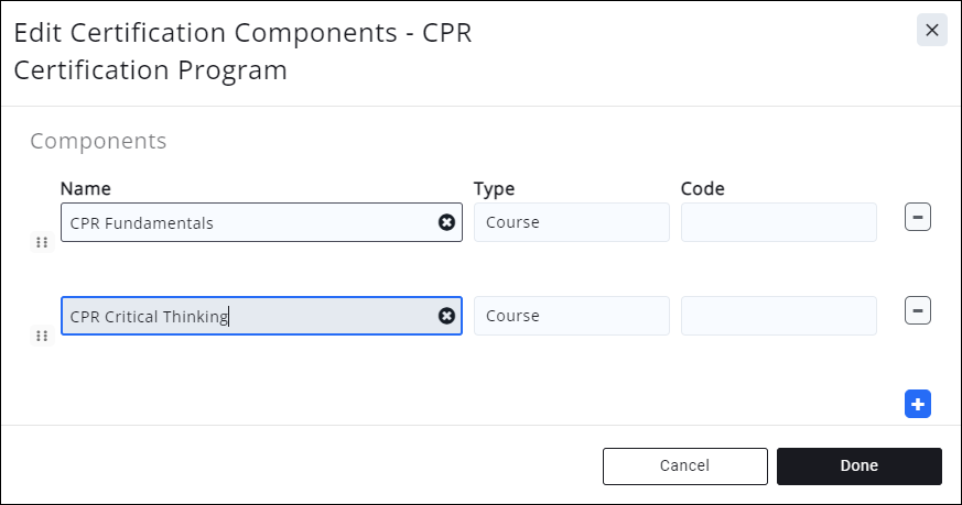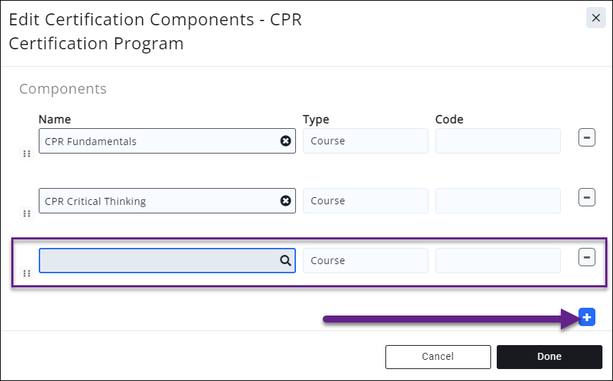 - Begin typing the Name of the component. Type ahead functionality will find the component, and populate the Type and Code. Repeat this step to add additional components.