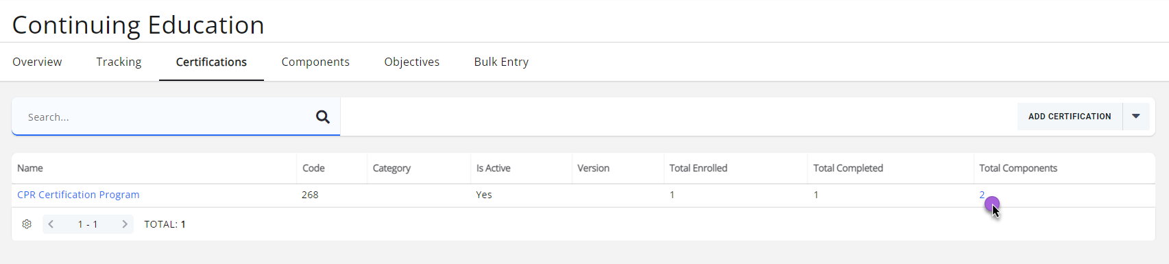 - Click the hyper-link in the Total Components column. If no components have been added to this certification No Total Components will be displayed. If components have been previously added, the number of components will be displayed.