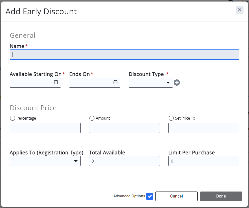 Early Registration Discount - provides a discount if a registration comes in between the Available Starting On date/time and the Ends On date/time
