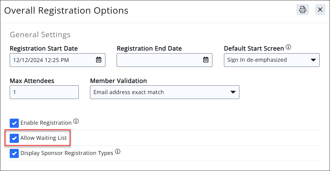 If you have a limit on the number of attendees for your event, you can enable a waiting list from the event's Attendee Setup tab, in the Overall Registration Options section. See Overall Registration Options for instructions.