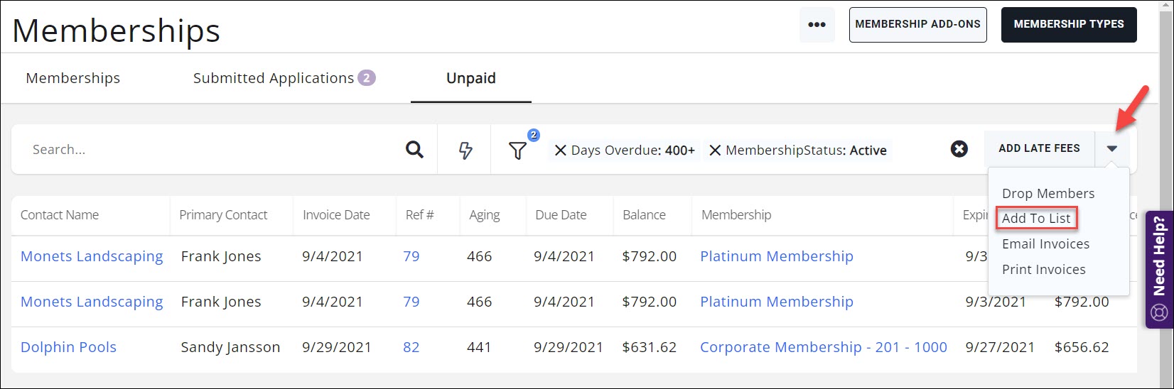 From the Unpaid tab, in the Membership module, you will be able to easily add unpaid members to a communications list. For Example: You may wish to create a list to send an email to all unpaid members letting them know that a late fee has been added to their invoice.