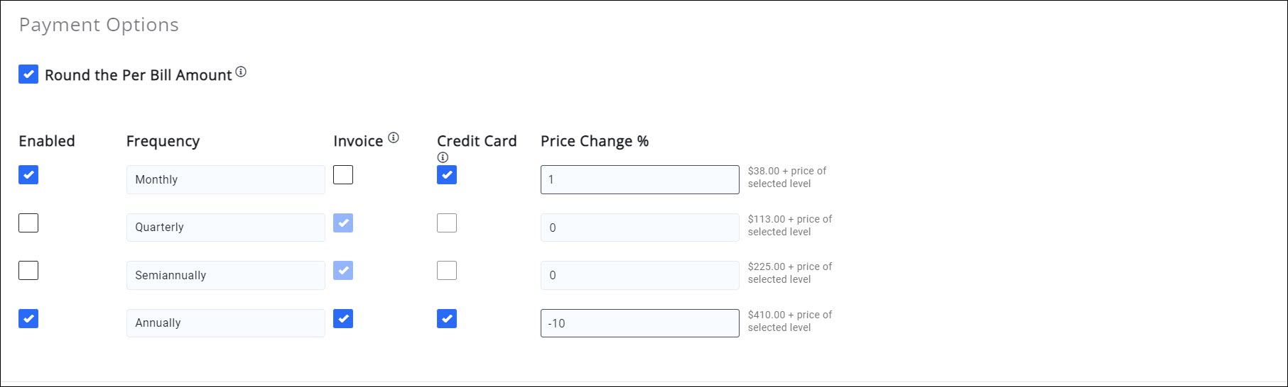 - In the Payment Options section, choose the Proration Interval you wish to use for each frequency. NOTE: The system will not prorate new membership fees if the proration interval is longer than the billing frequency. For example, Quarterly payments cannot be prorated on a Semiannual basis. See Proration Examples for details on the impact of each option. for information on result of each proration option.
