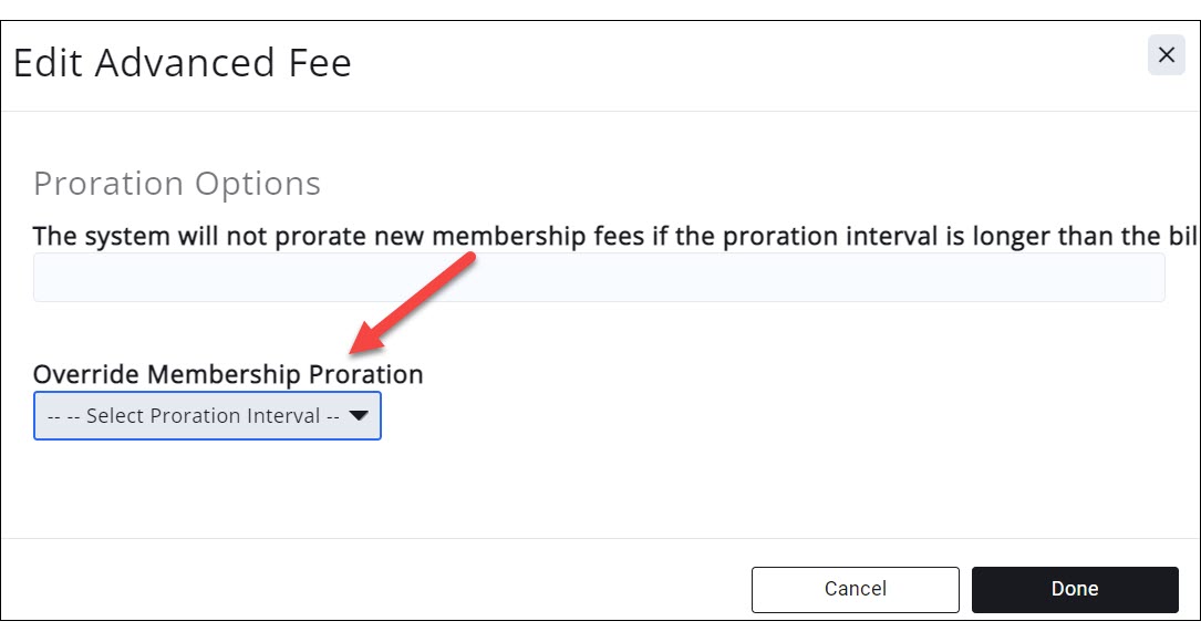 - From Override Membership Proration select the desired proration option. See Proration Examples for details on the result of each option.