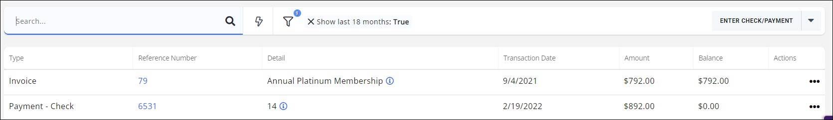 Transaction History for an individual contact may be viewed and managed in the Billing History section of the contacts Billing tab. From this tab, you will be able to accept cash/check/credit card payments, create write-offs, download or email invoices. By default (for system performance reasons) only the last 18 months of transactions will be displayed. Clear 'Show last 18 months True' then click Customize Results if you wish to see additional transactions.