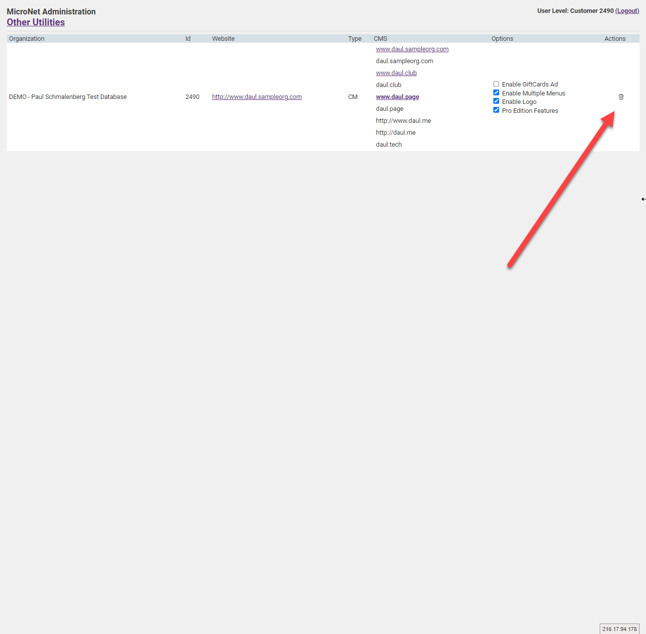 Find the proper database/website and delete it using the trashcan