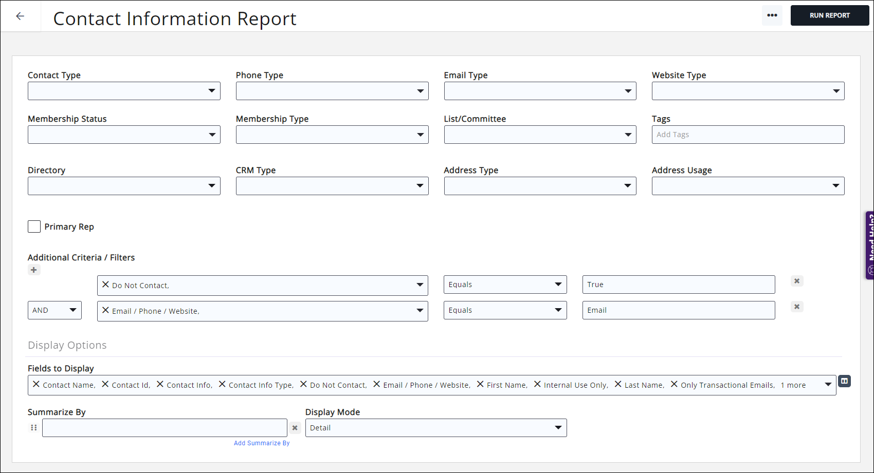 Contact Information Report Example: Identify contacts whose emails are marked as Do Not Contact January 29, 2026 10:51 Updated Do Not Contact Equals True AND Email/Phone/Website Equals Email. See the following for Common Report Functions: Export Reports Email Reports Add Report Contacts to a List/Committee Mailing Labels Save a Report as a New Report Save a report as a Favorite Report Report Filtering Options