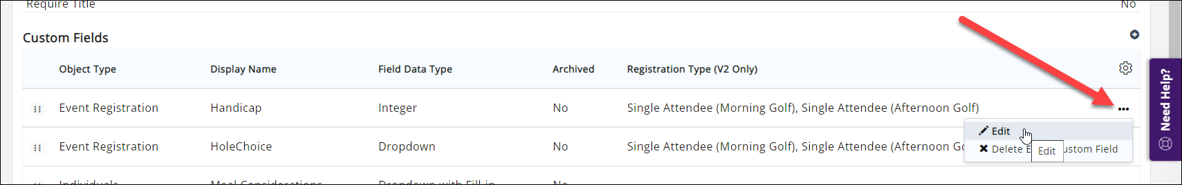 Edit an Event Custom Field January 29, 2026 13:07 Updated For the desired event, click the Attendee Setup tab. In the Custom Fields section, click the icon in the Actions column for the desired custom field and select the "Edit" option. Make the needed changes. Click Done.