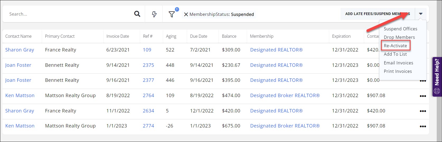 - Filter the invoices to members who have been suspended by clicking Show Only or Customize Results.