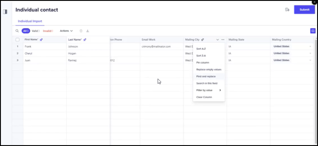 A drop-down list of available options for modifying/adding multi-choice options after the import are given. A checkbox in front of the row allows for deleting the row. Display only the columns you want to see while finalizing the import data. This allows you to hide columns that aren't critical in your final review or simply hide blank columns. Use Find and replace and Search options to make data corrections. Pin key columns to the left for data review on larger data sets. Collapse the left side-bar for increased viewing space. On the last screen, you have the ability to download your import file. This is helpful if you have made on-screen changes. -