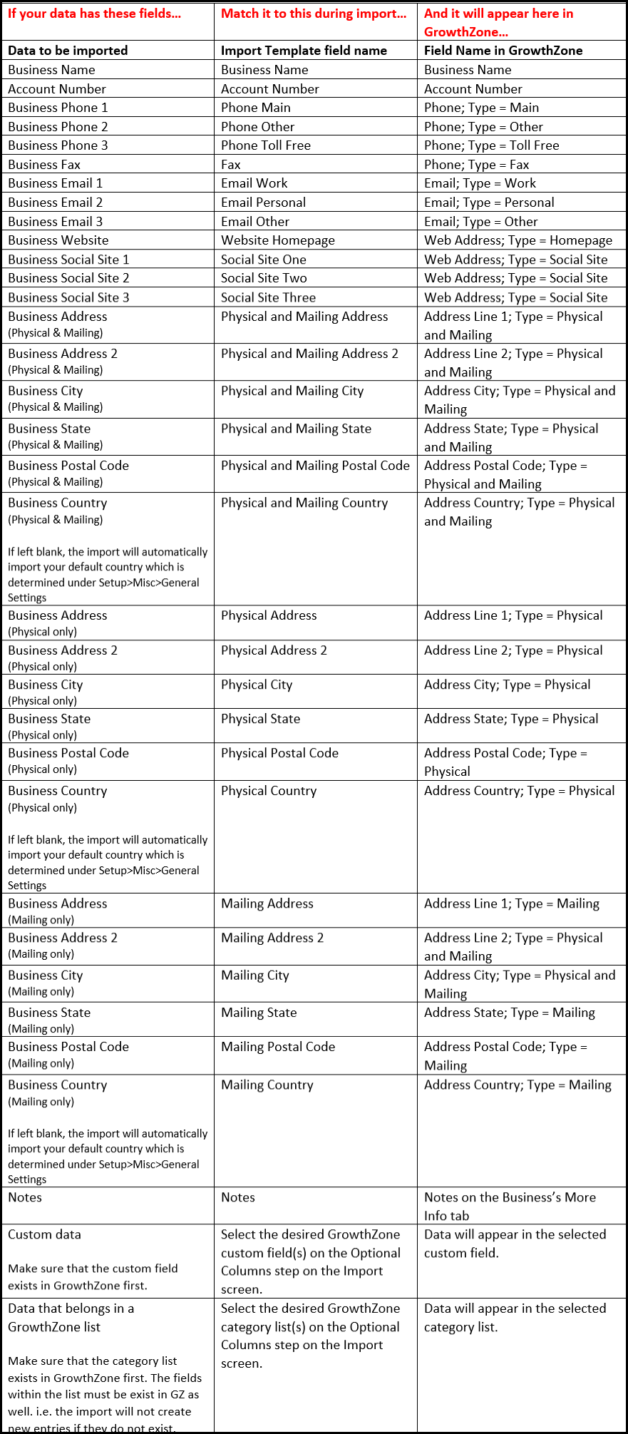 - If the import file contains any of the following, please make sure that the fields exist in GrowthZone so you can map to them.