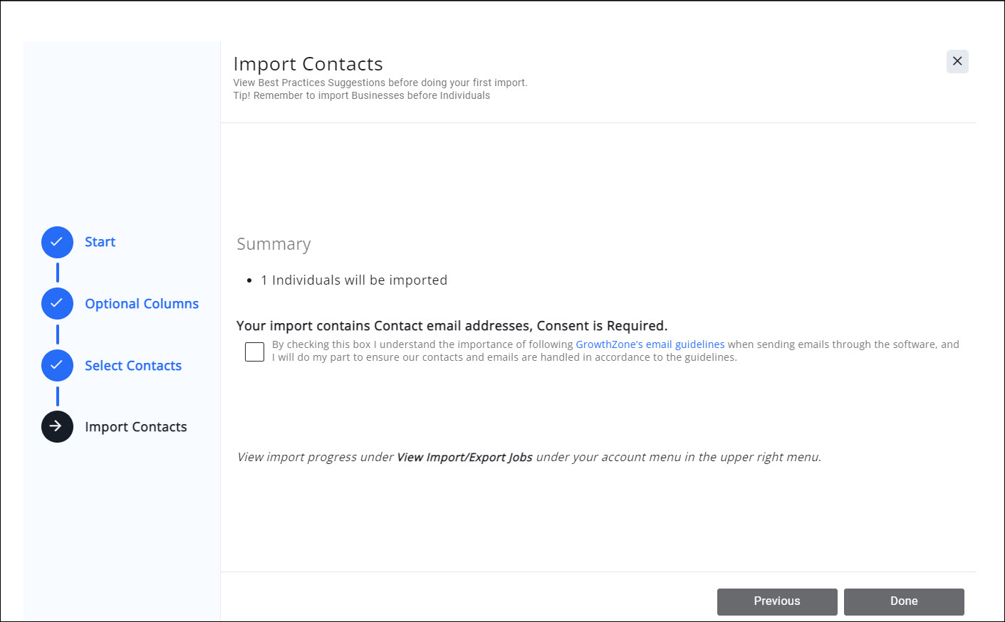 On the final Import Contacts you must agree to the following condition: By checking this box I understand the importance of following GrowthZone email guidelines when sending emails through the software, and I will do my part to ensure our contacts and emails are handled in accordance to the guidelines.