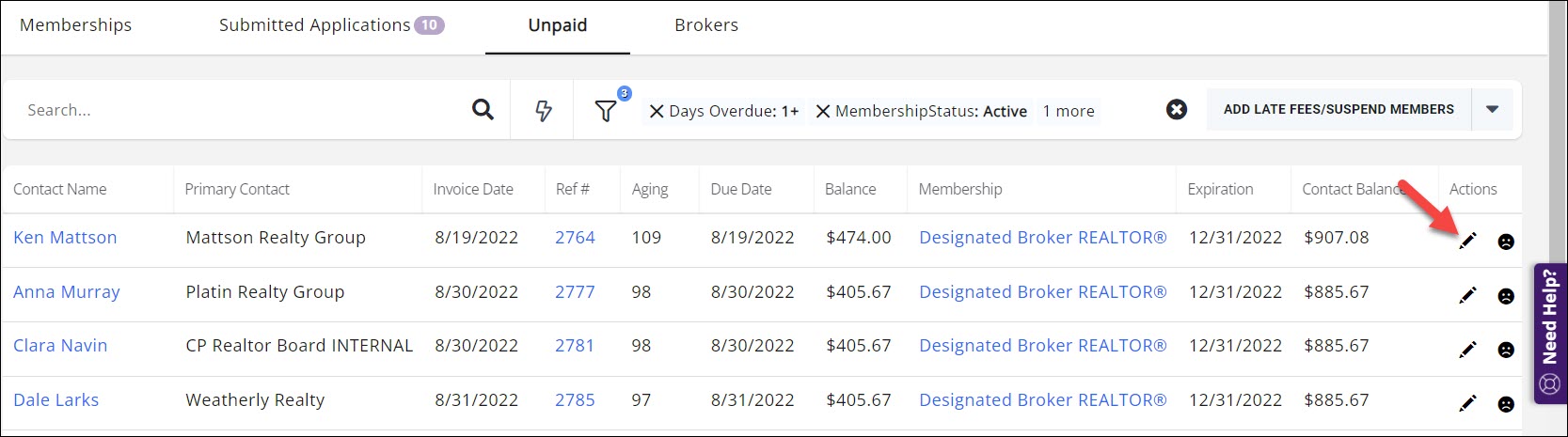 From the Unpaid tab, in the Membership module you have the ability to suspend members. This can be done individually or in bulk. IMPORTANT: If a member pays the past due invoice, the membership will automatically be re-activated, provided there are no additional invoices that are past due beyond the window set under Setup > Membership Settings. See Link NRDS, MLS, Lockbox status to Membership Status for further information.